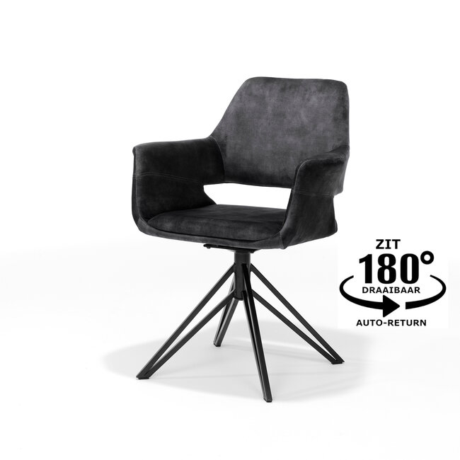 De zachte Aurora Velours stof in Antraciet uitvoering geeft de stoel een warme en luxe uitstraling die perfect past in zowel moderne als hotel-chique interieurs. De ergonomisch gevormde zitting en de comfortabele armleuningen bieden extra ondersteuning, waardoor je probleemloos lange avonden kunt tafelen of werken aan tafel.