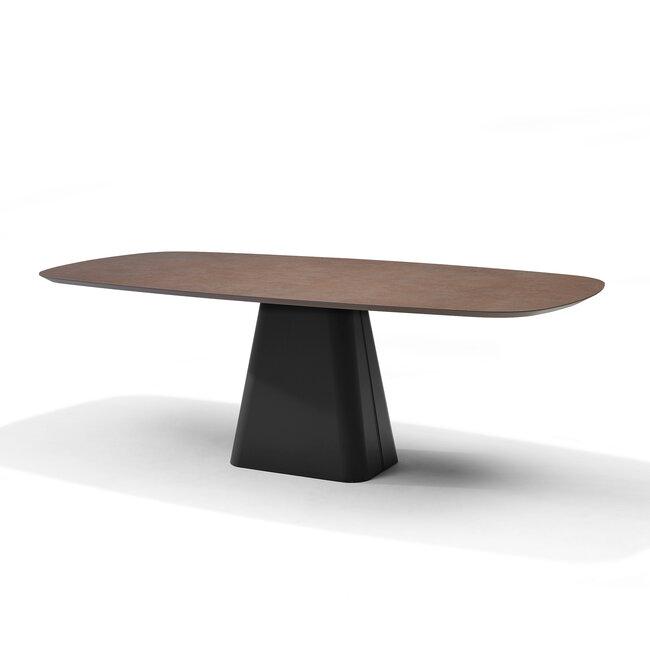 De warme Ferro Brons kleur geeft de tafel een stijlvolle en moderne uitstraling en past perfect binnen interieurstijlen zoals hotel chic, industrieel en modern. De Deens ovale vorm zorgt voor zachte lijnen en een ruimtelijk effect, waardoor de tafel elegant oogt en extra zitplaatsen mogelijk maakt.