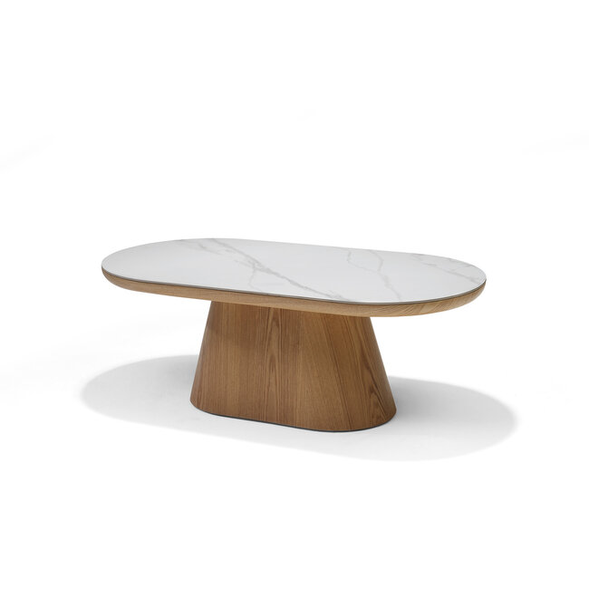 DELOS Salontafel Wit Deckstone 120x60 - Eiken naturel kolomvoetOok leverbaar met Travertin bovenbladDeckstone / Sintered Stone is een synthetische steensoort, vervaardigd uit enkel anorganische grondstoffen, waardoor het een zeer natuurlijke uitstraling heeft. Mét een hele reeks aan fijne eigenschappen, waarvan vlekvastheid wellicht de prettigste is.Deckstone/Sintered stone is vergelijkbaar met keramiek, het verschil zit met name in het productieproces. Bij de productie van Deckstone wordt het proces van natuursteenvorming nagebootst. Terwijl natuursteen, zoals marmer en graniet, in de loop van duizenden jaren wordt gevormd, duurt het bij Deckstone slechts een paar uur. Mineralen en steendeeltjes, zoals die gevonden worden in porselein of graniet, worden zorgvuldig geselecteerd. Deze deeltjes worden vervolgens aan extreme hitte en druk blootgesteld. Wanneer het proces is voltooid, worden de deeltjes permanent aan elkaar gehecht, zonder dat er harsen of bindmiddelen nodig zijn. De Deckstone tafelbladen worden onder veel hogere druk geproduceerd dan keramiek wat zorgt voor extra compactheid. En heeft u geen zorgen over krassen of vlekken dit kan niet doordringen tot het materiaal. Zelfs de meest hardnekkige vlekken (bijvoorbeeld van wijn, koffie, stift of roest) kunt u gemakkelijk van het oppervlak verwijderen. Deckstone is niet poreus en bevat geen hars, waardoor het ook chemische stoffen kan verdragen. Het materiaal is krasbestendig en UV-stralen krijgen er geen vat op, dus van verkleuring is ook na verloop van tijd geen sprake. Bovendien is het slijtvaster dan graniet. Zelfs warme pannen kunnen direct op tafel!