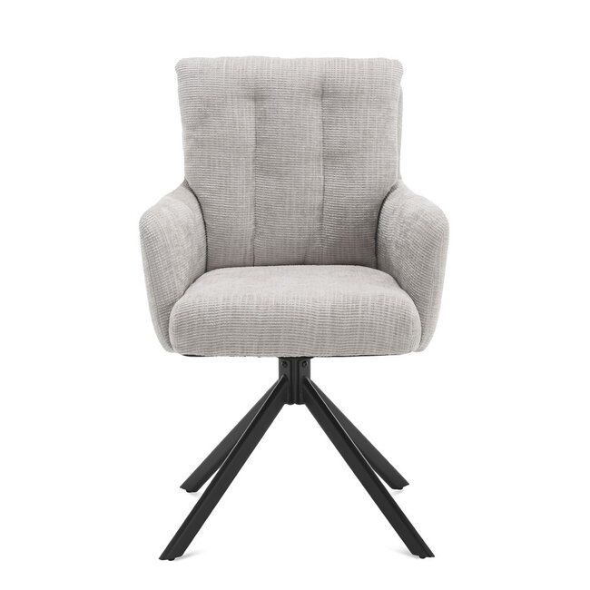 De hoge rugleuning en comfortabele armleuningen bieden extra ondersteuning, waardoor de stoel ideaal is voor lange diners of gezellige avonden aan tafel. De zachte bekleding in lichtgrijze uitvoering geeft de stoel een warme en moderne uitstraling die eenvoudig te combineren is met verschillende interieurstijlen.
