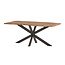 Bij deze boomstam tafels zijn de lange zijden afgewerkt met organische boomkanten, hierdoor is ieder blad anders. Het blad is gemaakt van circa 40 mm. massief, mat gelakt acaciahout. De metalen spinpoot zorgt voor optimale ruimte voor eetkamerstoelen. U schuift er makkelijk extra stoelen bij aan zonder dat de poot in de weg zit.