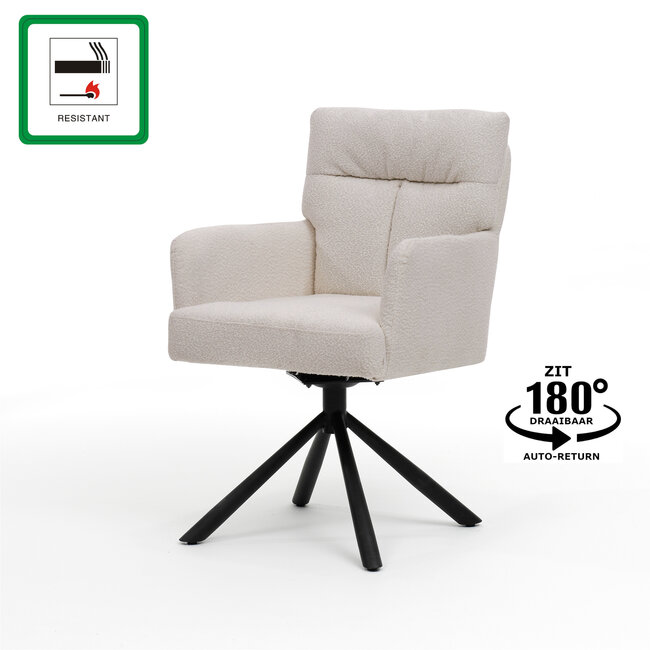 De zachte Teddy stof in de kleur Natural geeft de stoel een warme en luxe uitstraling. Daarnaast is deze uitvoering voorzien van UKFR brandvertragende eigenschappen, wat zorgt voor extra veiligheid en duurzaamheid in dagelijks gebruik. De comfortabele armleuningen en de ergonomisch gevormde zitting bieden goede ondersteuning tijdens lange diners of gezellige momenten aan tafel.