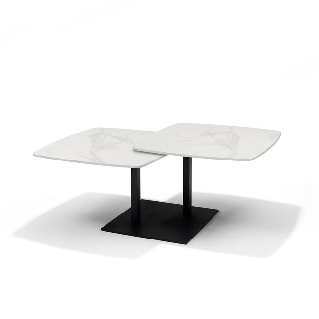 Gemini Salontafel - Wit Deckstone - 2 Bladen SchuifbaarDeckstone / Sintered Stone is een synthetische steensoort, vervaardigd uit enkel anorganische grondstoffen, waardoor het een zeer natuurlijke uitstraling heeft. Mét een hele reeks aan fijne eigenschappen, waarvan vlekvastheid wellicht de prettigste is.Deckstone/Sintered stone is vergelijkbaar met keramiek, het verschil zit met name in het productieproces. Bij de productie van Deckstone wordt het proces van natuursteenvorming nagebootst. Terwijl natuursteen, zoals marmer en graniet, in de loop van duizenden jaren wordt gevormd, duurt het bij Deckstone slechts een paar uur. Mineralen en steendeeltjes, zoals die gevonden worden in porselein of graniet, worden zorgvuldig geselecteerd. Deze deeltjes worden vervolgens aan extreme hitte en druk blootgesteld. Wanneer het proces is voltooid, worden de deeltjes permanent aan elkaar gehecht, zonder dat er harsen of bindmiddelen nodig zijn. De Deckstone tafelbladen worden onder veel hogere druk geproduceerd dan keramiek wat zorgt voor extra compactheid. En heeft u geen zorgen over krassen of vlekken dit kan niet doordringen tot het materiaal. Zelfs de meest hardnekkige vlekken (bijvoorbeeld van wijn, koffie, stift of roest) kunt u gemakkelijk van het oppervlak verwijderen. Deckstone is niet poreus en bevat geen hars, waardoor het ook chemische stoffen kan verdragen. Het materiaal is krasbestendig en UV-stralen krijgen er geen vat op, dus van verkleuring is ook na verloop van tijd geen sprake. Bovendien is het slijtvaster dan graniet.