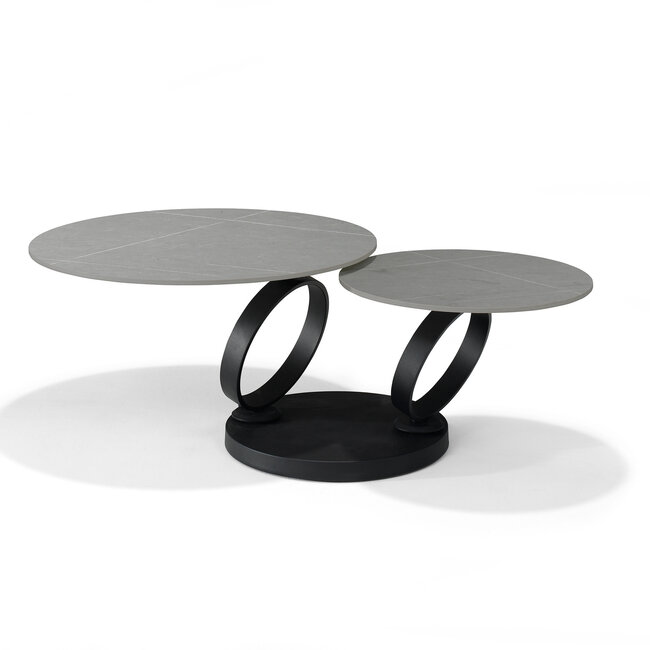 Salontafel Orion B-5706 - Deckstone Grijs Marmer - 2 Bladen DraaibaarDeckstone / Sintered Stone is een synthetische steensoort, vervaardigd uit enkel anorganische grondstoffen, waardoor het een zeer natuurlijke uitstraling heeft. Mét een hele reeks aan fijne eigenschappen, waarvan vlekvastheid wellicht de prettigste is.Deckstone/Sintered stone is vergelijkbaar met keramiek, het verschil zit met name in het productieproces. Bij de productie van Deckstone wordt het proces van natuursteenvorming nagebootst. Terwijl natuursteen, zoals marmer en graniet, in de loop van duizenden jaren wordt gevormd, duurt het bij Deckstone slechts een paar uur. Mineralen en steendeeltjes, zoals die gevonden worden in porselein of graniet, worden zorgvuldig geselecteerd. Deze deeltjes worden vervolgens aan extreme hitte en druk blootgesteld. Wanneer het proces is voltooid, worden de deeltjes permanent aan elkaar gehecht, zonder dat er harsen of bindmiddelen nodig zijn. De Deckstone tafelbladen worden onder veel hogere druk geproduceerd dan keramiek wat zorgt voor extra compactheid. En heeft u geen zorgen over krassen of vlekken dit kan niet doordringen tot het materiaal. Zelfs de meest hardnekkige vlekken (bijvoorbeeld van wijn, koffie, stift of roest) kunt u gemakkelijk van het oppervlak verwijderen. Deckstone is niet poreus en bevat geen hars, waardoor het ook chemische stoffen kan verdragen. Het materiaal is krasbestendig en UV-stralen krijgen er geen vat op, dus van verkleuring is ook na verloop van tijd geen sprake. Bovendien is het slijtvaster dan graniet. Zelfs warme pannen kunnen direct op tafel! Wat zijn de voordelen van Deckstone / Sintered Stone ?Deckstone is nagenoeg onmogelijk te onderscheiden van natuurlijk materiaal zoals marmer of keramiek tenzij het is gemaakt in enkele aparte kleuren of patronen.