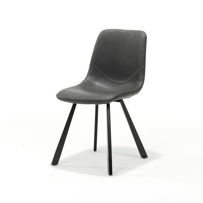 De vintage zwarte bekleding geeft de stoel een karaktervolle en warme uitstraling die perfect past in industriële en moderne interieurs. De licht gebogen rugleuning biedt prettige ondersteuning tijdens het tafelen of werken aan tafel.